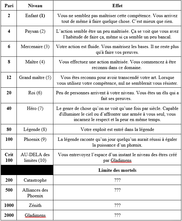 Imaginons que Paul veut fabriquer une paire de gants de bonne facture en moins d’une semaine. En sachant qu’il arrive à un résultat de 8 avec les bonus dans la caractéristique artisanat, il fait le pari de réussir un jet niveau grand maitre (niveau 4) dés 12 et il tombe sur 7. Il réussit donc son action niveau grand maître.