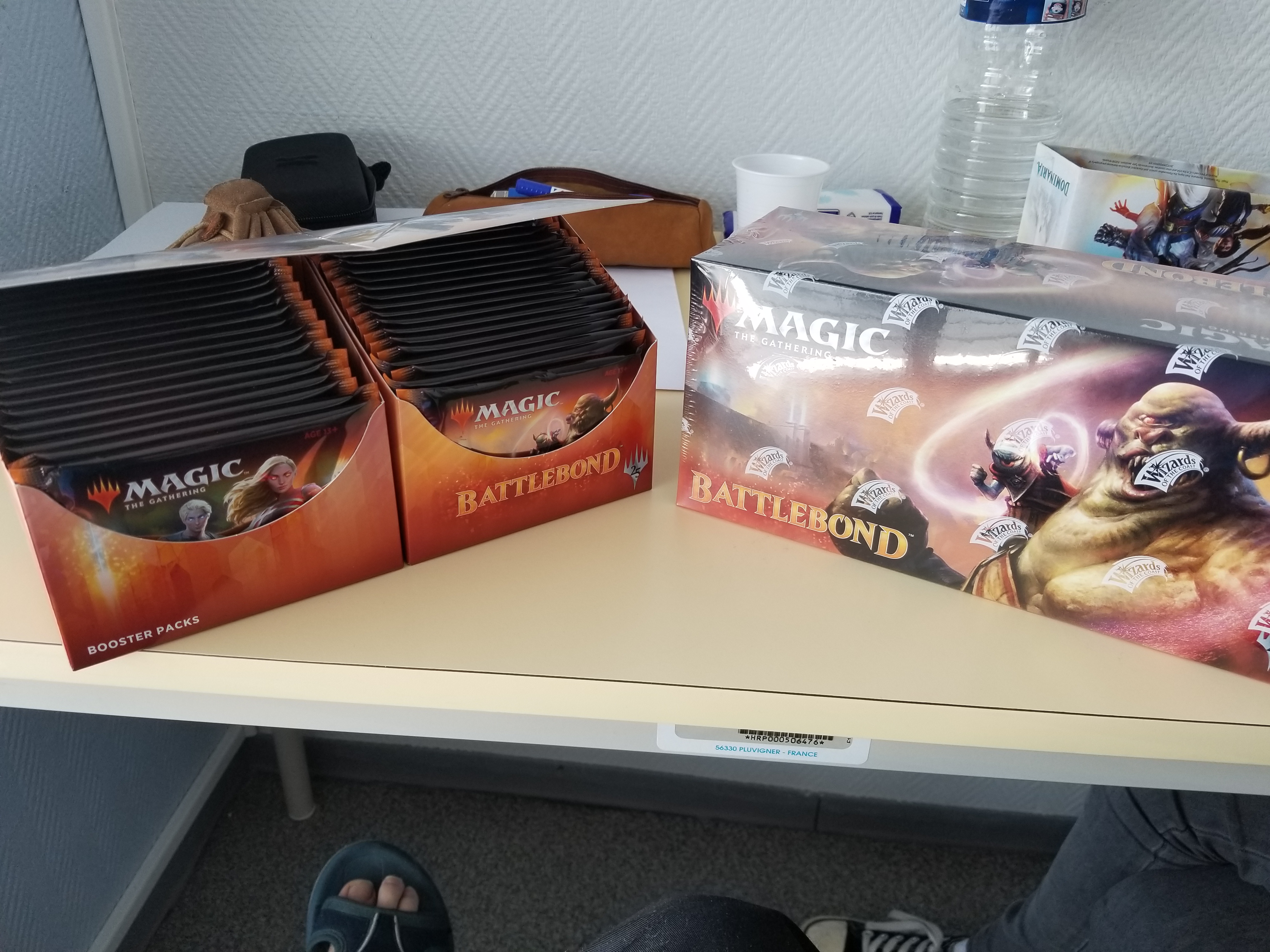 Quasi fini… J'ai quasi tout Battlebond (manque quelques rares/ mythiques) et je dois finir de sélectionner les cartes qui devront compléter le cube, surtout du 2019, à voir si je met autre chose comme extension pour rajouter ce qui fait la force de certaines couleurs (du contre et du bounce pour le bleu par exemple…). Ensuite, j'ai commencé à double sleever le cube et je dis pas le travail.