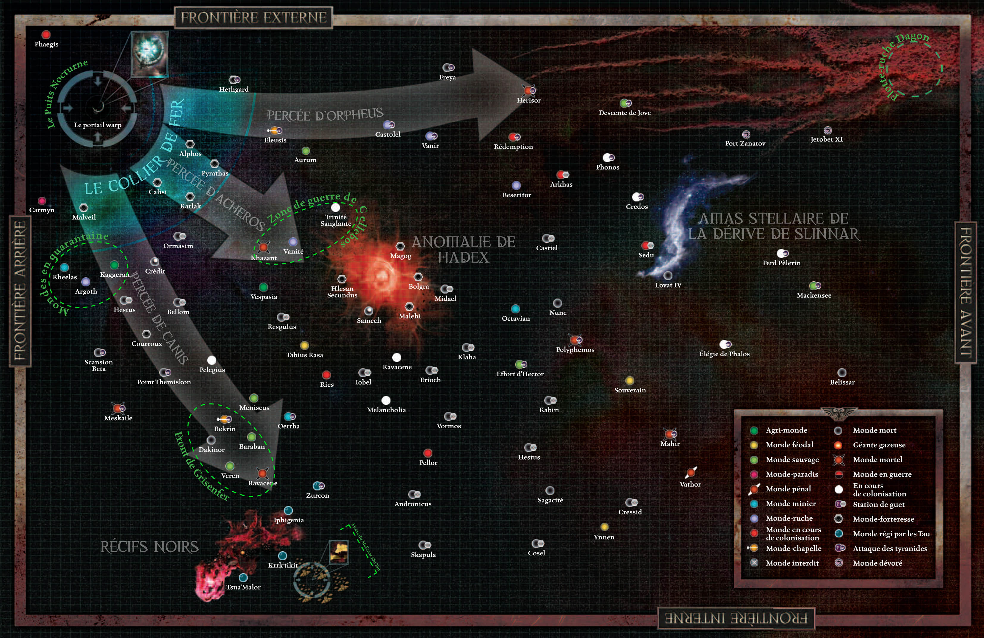 * Si le Mechanicum Noir est capable de "gérer" les Tyranides ou du moins les contrôler un temps suffisant pour les emmener n'importe où, est-ce que ça ne pourrait pas être dans le but de lancer une grosse attaque organisée pour en profiter et s'en prendre au Portail Warp ? Pour le détruire ou le transformer (après tout il y a du Chaos derrière tout ça) avec la technologie que le Mechanicum Noir recherche ? Il y a un monde-forteresse du Collier de Fer clairement sous attaque Tyranide selon la carte (Hethgard).